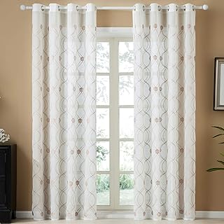 Topfinel Rideau Voilage Decoration Chambre Broderie de Cercle et Fines Rayures Rideaux Salon manifique pour Cuisine 140x160cm, 2 pièces Brun