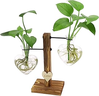 Terrarium en verre avec support en bois créatif en forme de double cœur - Vase transparent avec support en bois rétro - Vase de bureau pour la maison, le jardin, le bureau, la décoration de mariage