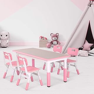 Bamny Ensemble Table et Chaises pour Enfant, Inclus 1 Table et 4 Chaises, Table à Dessin Réglable en Hauteur pour Enfants de 2 à 10 ans (Rose)