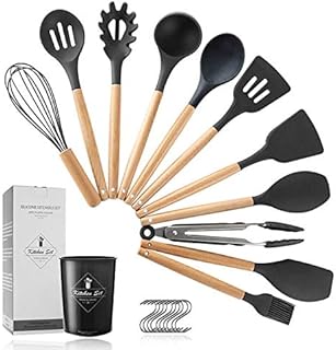 SaiXuan Ustensiles de Cuisine,Silicone Ustensiles de Cuisine en Bois Ustensiles Cuisine Antiadhésive Set,Silicone de qualité Alimentaire,12 pièces ustensiles de Cuisine+12 S Crochets